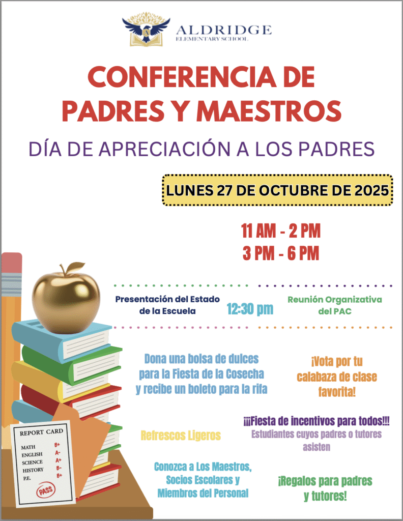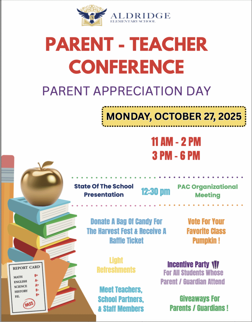 • Aldridge Parent Appreciation Day (Parent Teacher Conferences – Monday, 10/27/25